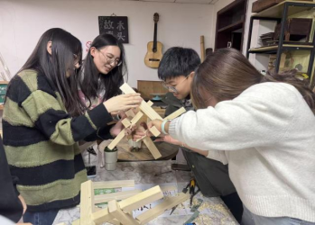 本次挑战活动以“理论讲解 + 动手实践”的沉浸式制作形式展开。在史圣洁、庞冠男两位老师的悉心指导下,同学们系统学习斗、拱、昂等构件的形制逻辑与结构原理。实践环节采用小组协作形式,每六人一组,明确分工后分别制作榫卯构件,最后协同完成榫卯模型的精准拼接。活动全程严格遵循古法,不使用任何钉、胶,仅凭榫卯咬合实现结构稳固。临近尾声时,现场组织了紧张激烈的拼接时长竞赛,将气氛推向高潮。