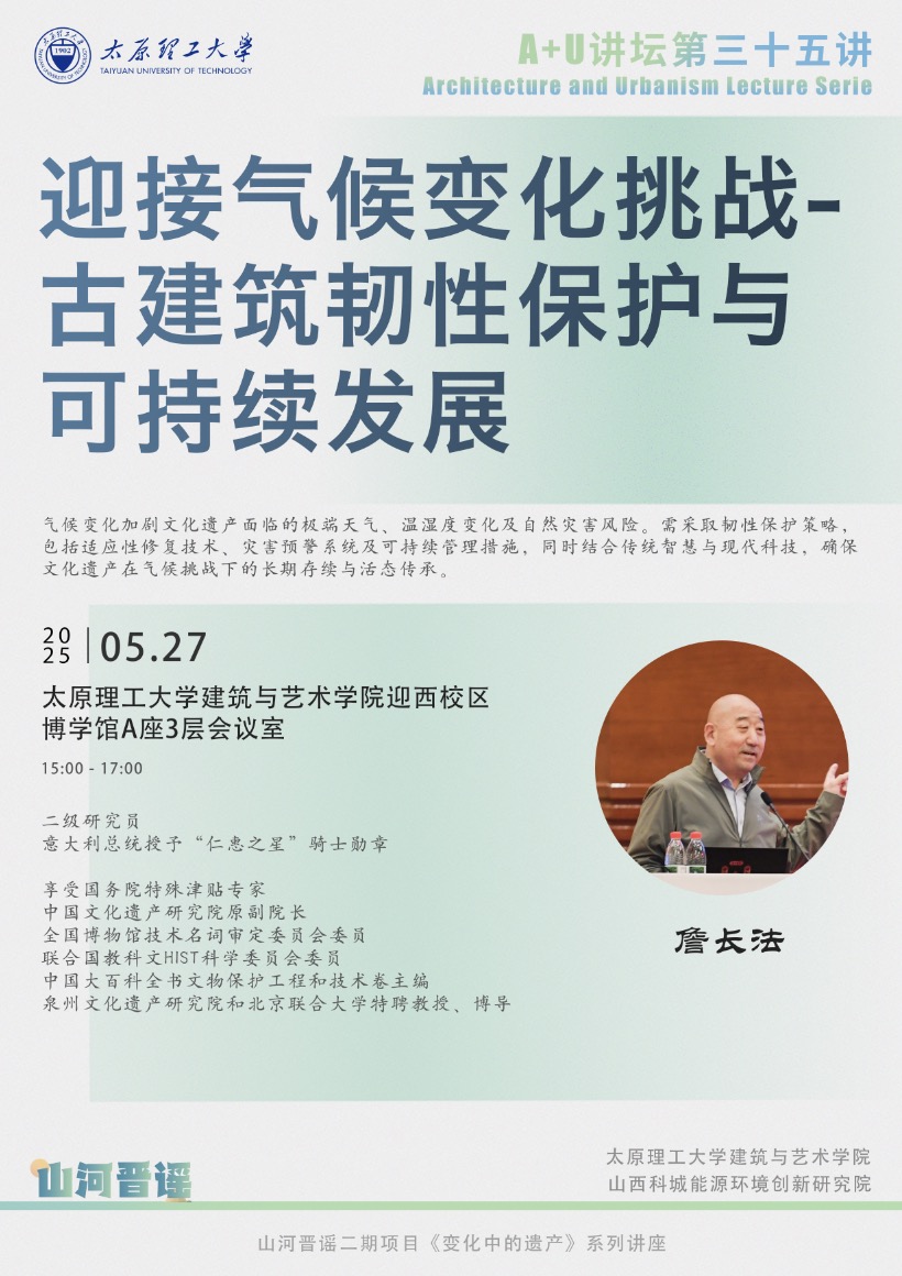 5月27日下午,中国文化遗产研究院原副院长、二级研究员詹长法在伟德BV1946做题为《迎接气候变化挑战-古建筑韧性保护与可持续发展》学术讲座,从专业角度分析了在气候变化的条件下建筑遗产保护利用的途径。气候变化加剧文化遗产面临的极端天气、温湿度变化及自然灾害风险。需采取韧性保护策略,包括适应性修复技术、灾害预警系统及可持续管理措施,同时结合传统智慧与现代科技,确保文化遗产在气候挑战下的长期存续与活态传承。本次讲座具有很强的启发性,师生积极参与互动,一致好评。