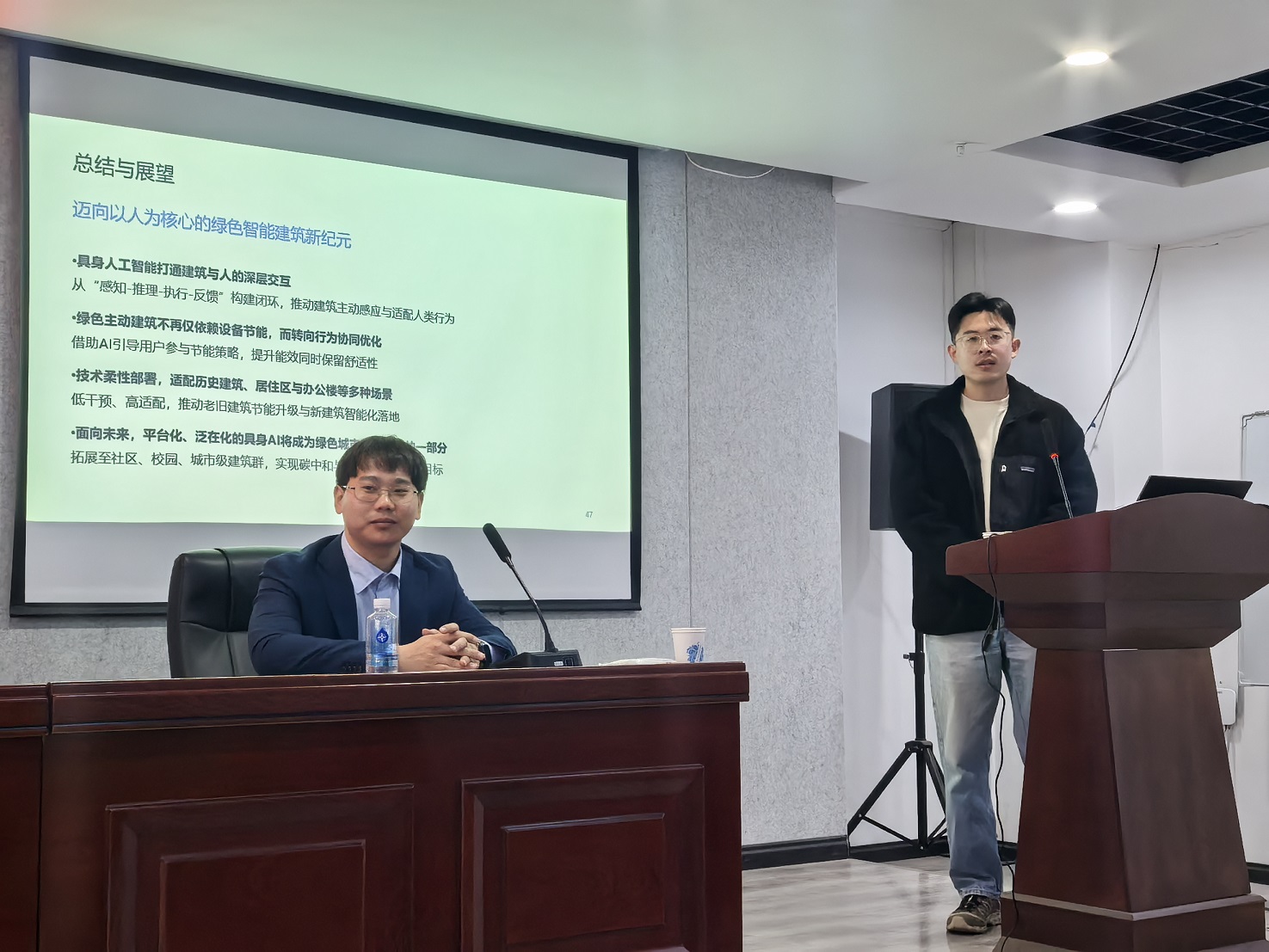 讲座中,周忠潮博士围绕建筑学科与人工智能技术的交叉融合展开深入分享,聚焦“具身AI”在绿色建筑中的应用实践。他提出,从传统“关注身体健康”的建筑设计目标,正在向“关注能耗习惯”与“节能行为塑造”的方向转变。未来的建筑不仅要提升居住舒适性,更应主动引导人们形成良好的用能行为,进而实现更广义上的健康与可持续。
