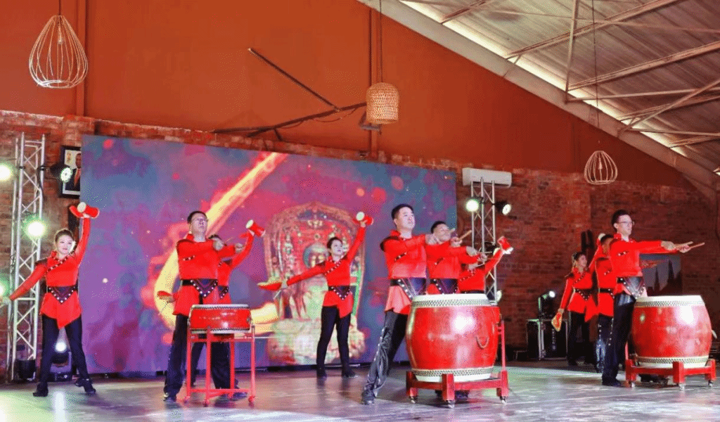 在盛大的招待会上,由曹岩老师精心编排,并携手山西文艺演出团的成员共同演绎的一曲鼓乐《盛世鼓舞》震撼开场,鼓声震天,磅礴的气势瞬间点燃了现场观众的热情。随后,变幻莫测的魔术表演、独具韵味的山西民歌、民舞等节目轮番上演,赢得了现场观众的阵阵掌声。