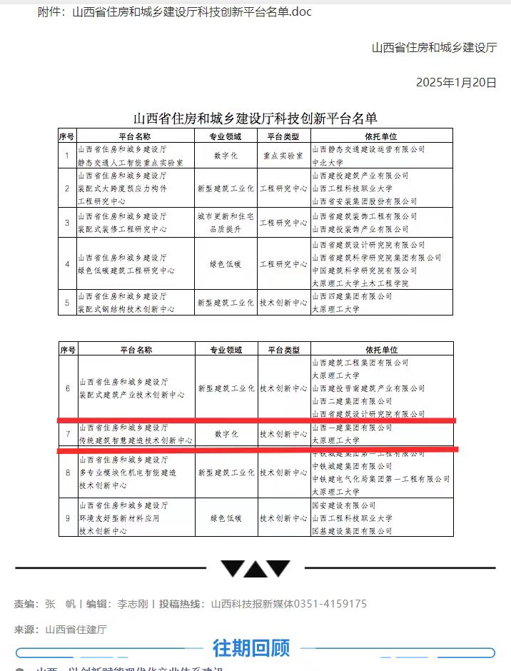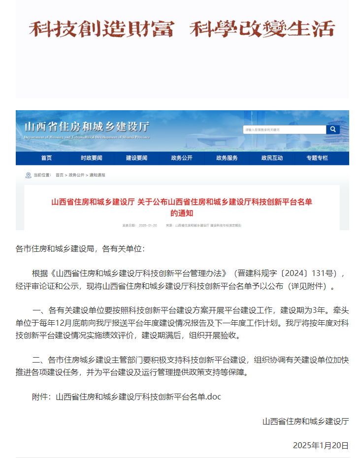 2025年1月20日,根据《山西省住房和城乡建设厅科技创新平台管理办法》(晋建科规字〔2024〕131号),围绕住房城乡建设绿色低碳、数字化、城市建设、城市更新和住宅品质提升、城乡历史文化保护、县城和乡村建设、新型建筑工业化、抗震防灾等重点领域,全省共有9个山西省住房和城乡建设厅科技创新平台名单予以公布。