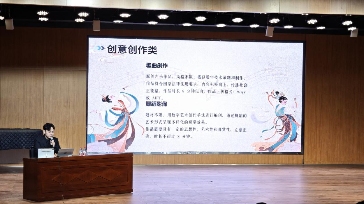 随后,我院佐熙泉老师向参会领导、老师和学生们详细地介绍了本次大赛的背景意义、组织架构、参赛对象及要求、奖项设置及报名流程等,让与会人员进一步了解“中国好创意音乐舞蹈专项大赛”赛事章程与相关规则。
