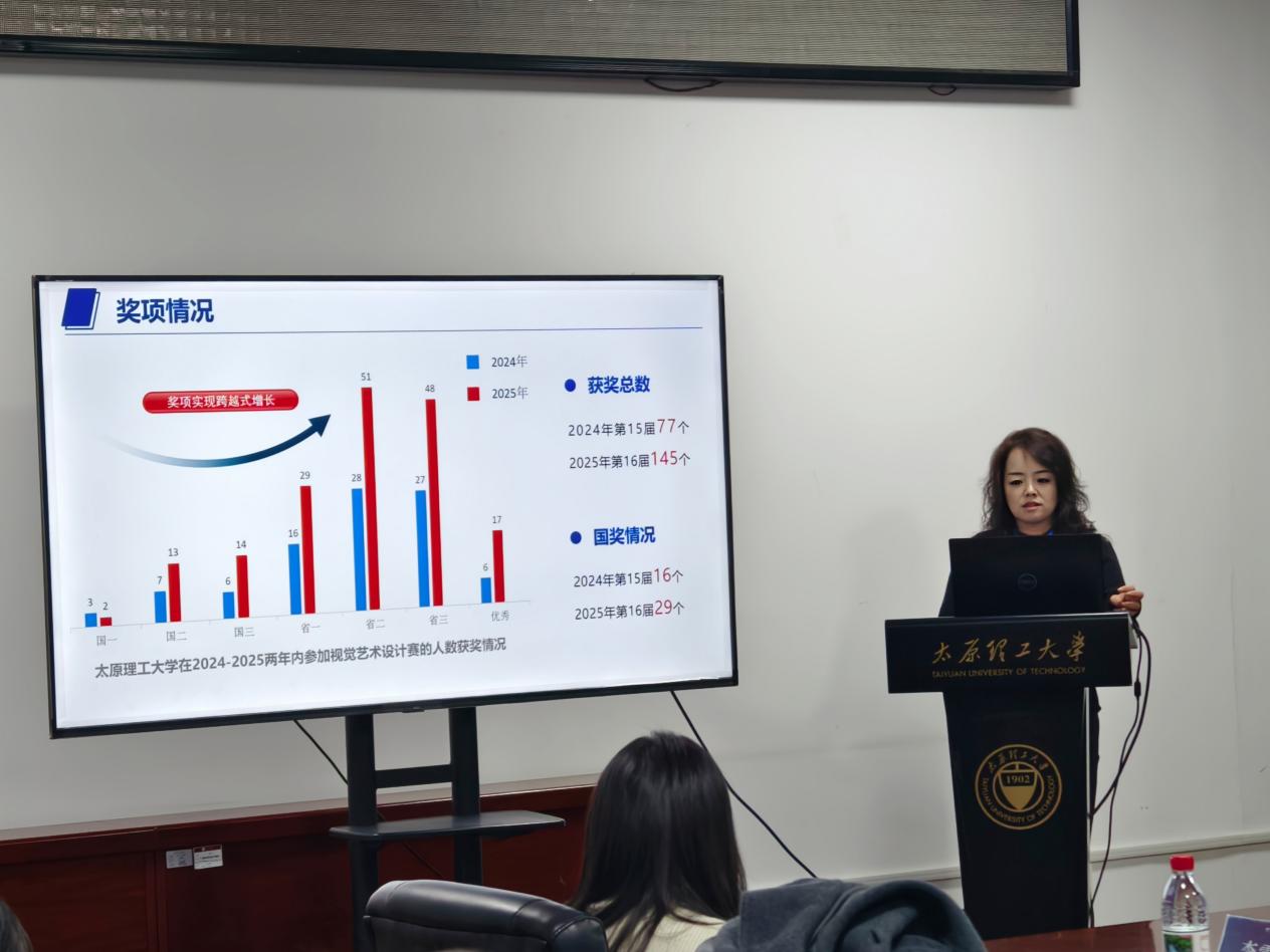 伟德BV1946赵娟副教授针对bevitor伟德国际1946近两年参加蓝桥杯视觉艺术设计赛的参赛成果做了详实汇报。国奖数量从 16 个提升至 29 个,成果实现跨越式增长。参赛作品涵盖文化传承、数字技术等多领域,彰显 “文化 + 科技 + 设计” 创新理念。学校以 “以赛促教、以赛促学、以赛促创” 为导向,助力学生成长与成果转化,未来将深化赛教融合,进一步提升赛事影响力。